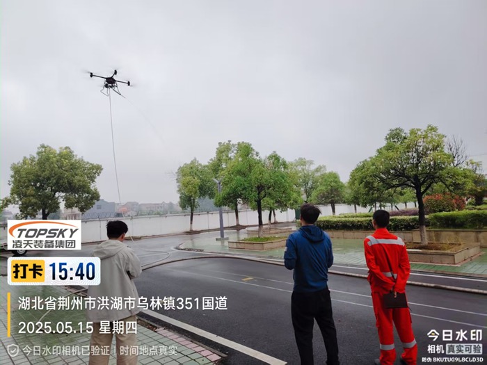 該無人機可裝載在消防車上,能快速啟動升空,通過特制高壓水帶與消防車水罐連接,消防車水罐內(nèi)部高效泡沫/水基滅火劑輸送到無人機平臺,在水槍噴口水平噴射出去,達到滅火的效果。